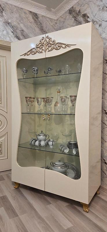 Klassik üslubda qonaq otağı üçün mebel dəsti Tərkibi: - Şüşə vitrindən ibarət böyük bufet: iki ədəd şüşə qapı, içəridə 3 səviyyəli rəf sistemi, yanlarda dekorativ bəzəklər, aşağı hissədə 2 cüt tut...