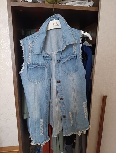 - 2-ci məhsul: Cins jilet. Qolları kəsik, paçaları və ətəyi püsküllü. Öndə düyməli, iki sinə cibı və dekorativ cırıntılarla streetwear görünüşü.