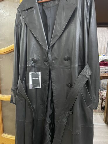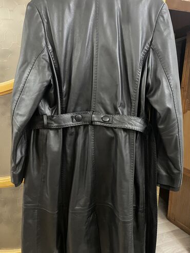 Qadın üçün qara dəri trençkot - Model: beldən kəmərli, ikiqat döşlü (double-breasted görünüş), geniş qalstuk-yaxalı - Material: qara ekodəri (süni dəri təsviri), içi astarlı - Ölçü: XL (etiketdə g...