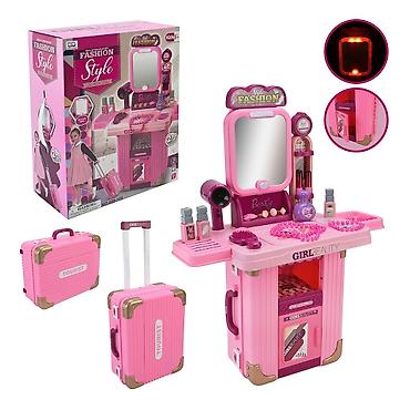 Детский трюмо чемодан косметики.Игровой набор Xiong Cheng «Салон красоты» выполненный в виде розового чемодана на колесиках. Этот многофункциональный набор «3 в 1» легко трансформируется из компактного чемодана в полноценный туалетный столик (трюмо).