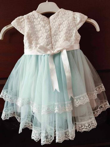 Uşaq/gecəlik ziyafət paltarı – açıq mavi rəngdə. 1defe de geyinilmeyib,cox gozel - Model: yuxarı hissəsi krujeva (naxışlı) parçadan, aşağı hissəsi çoxqatlı şifon/orqanza ətək - Üst hissədə daş və ...