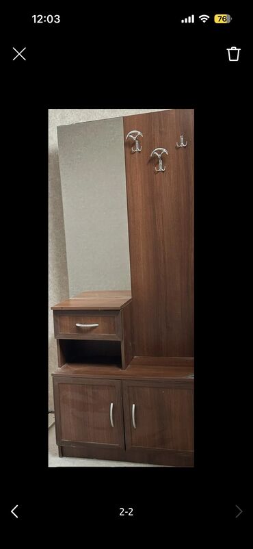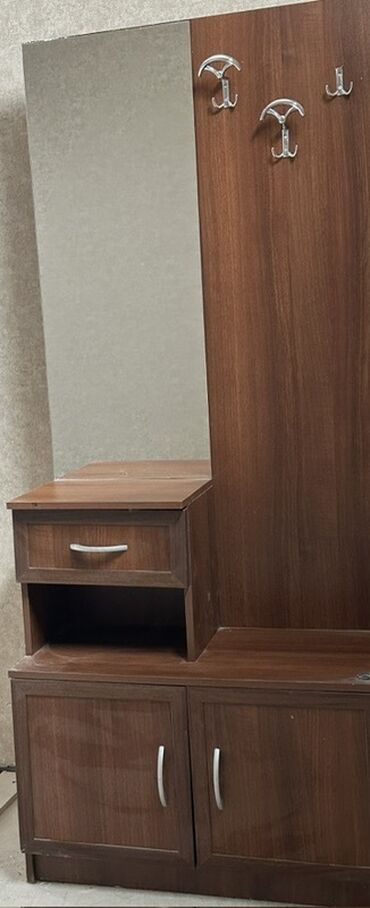 2) Asılqanlı konsol-güzgü bloku – iri vertikal güzgü, 3 ədəd metal asılqan qarmaq, yuxarı hissədə masa səthi, bir gözlü çekmece, açıq rəf; aşağıda iki qapılı dolab hissəsi.