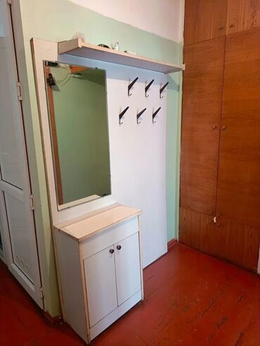 - Dəhliz komplekti: geniş güzgü, yuxarıda açıq rəf, 6 ədəd ikiqat asılqan qarmaq, aşağıda iki qapılı kiçik şkaf (ayaqqabı və aksesuar üçün uyğun). Kompakt ölçülü, funksional planlama.