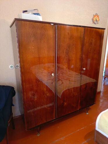 - Qarderob: klassik üslubda 3 qapılı, tünd taxta teksturalı parlaq səth, hündür ayaqlı korpus. Geyimlərin asılması üçün bölmə, əlavə rəflər üçün geniş həcmlidir.
