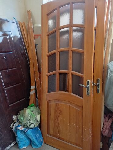- Şüşəli otaq qapısı: təbii ağac rəngində, üzərində dekorativ pəncərə bölmələri olan mat naxışlı şüşələr, metal qulplar və zamok mexanizmi ilə.