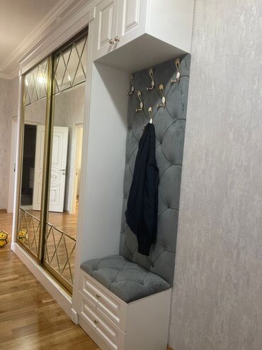 Dəhliz dolabı – ölçü 160×200×40 sm. - Güzgülü iki qapılı şkaf bölməsi - Yumşaq, kapitone başlıq və oturacaq hissəsi - Qızılı rəngdə çoxsaylı asılqanlar - Aşağıda qapılı dolab və istifadə rahatlığı...