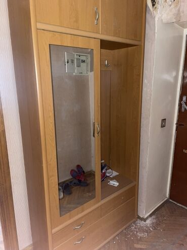 Mebel dəsti və şüşəli qapı - Dəhliz/antre üçün mebel komplekti: iri divar güzgüsü, paltar asmaq üçün 3 ədəd metal asqı, üst hissədə açıq rəf, ortada çekmecəli bölmə, aşağıda isə çoxsaylı qapılı do...