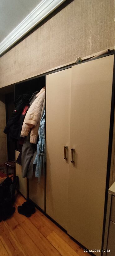 - İki qapılı şkaf: asılqan bölməsi, yuxarı rəf, daxili saxlama sahəsi. Açıq bej fasadlar və qara haşiyə, metall dəstəklər.