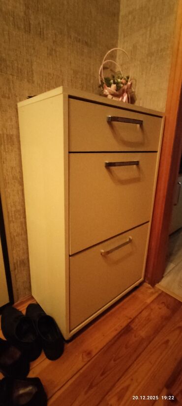 - Ayaqqabı dolabı: 3 bölməli açılan fasad, rahat tutacaqlar, kompakt ölçü, bej rəng.