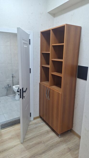 - Açıq rəfli kitab/aksesuar şkafı: yuxarıda 6 ədəd bölməli açıq rəflər, aşağıda iki qapılı qapalı bölmə, gümüşü tutacaqlar, taxta teksturalı səth.