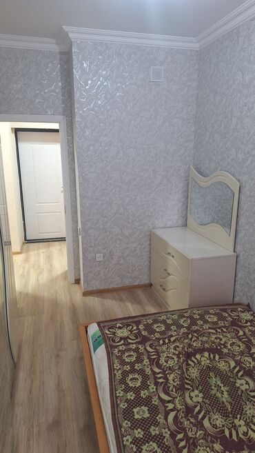 - Yataq otağı üçün komod-güzgü: 3 çekmecəli komod, üstündə bərkidilmiş dalğalı çərçivəli güzgü, açıq krem rəngdə, hamar səth və metal tutacaqlar.
