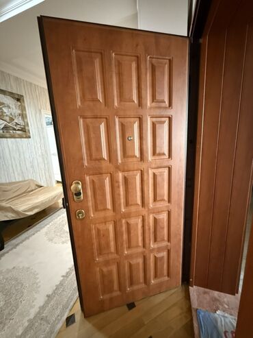 Metall qapı – ağac naxışlı, tünd qəhvəyi rəng. - Material: polad korpus, dekorativ MDF/laminat örtük - Ölçü: standart giriş qapısı ölçülərinə uyğun (təxmini 90×200 sm ətrafı – fotoya əsasən) - Diza...