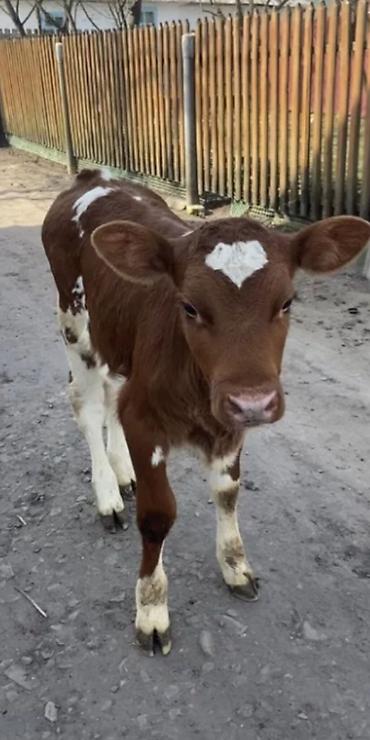 Simental tipli dişi buzov/malla – qırmızı-ağ rəngli, ləkəli naxışlı. Orta boylu, sağlam bədən quruluşu, düz ayaqlar və enli döş qəfəsi görünür. Boyun hissəsində dəmir zəncir bağlaması var, təsərrüf...