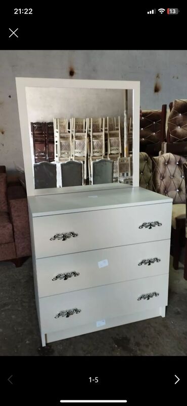Termo tualet masası və komod dəsti - Üstündə iri kvadrat güzgü - 3 çekmece: metal tutacaqlar, sakit açılıb-bağlanma - Rənglər: ağ və ağac teksturasının kombinasiya örtüyü - Klassik dekoratif ayaql...