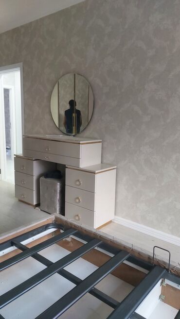 Ağ rəngdə güzgülü makiyaj/iş masası – “Termo” material. - Ölçü: 170 x 110 - Geniş güzgü - Sol tərəfdə 4 ədəd dərin çekmece - Üstdə 3 ədəd kiçik çekmece - Sağ tərəfdə açıq ayaqlıq/oturacaq yeri - Sa...