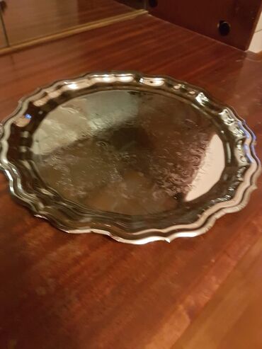 Gümüşü rəngdə, güzgü səthli dəbdəbəli servis sini/tray boyukdur heri