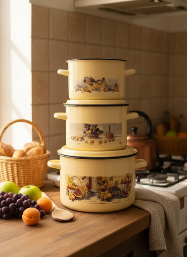 Aura qazan dəsti. 7 parçadan ibarətdir. 3 qazan 3 qapaq və süzgəc(və ya parovarka). Yenidir, istifadə olunmayıb. Böyük qazanın bor qulpu əyri və qırağında qırığı olduğu ücün endirim olunacaq