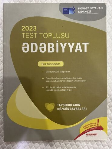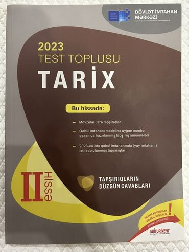 Xüsusiyyətlər: - Fənlər: Tarix (I və II hissə), Ədəbiyyat, İngilis dili (I hissə),Riyaziyyat (I hissə)Azərbaycan dili (I və II hissə) -Bəzilərinin kuponları silinib -Test kitabları yeni vəziyyətdədir -Hər biri endirim ilə 5 AZN