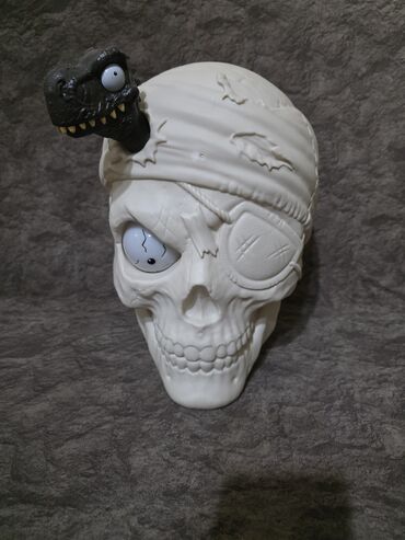 - Pirat bandanalı, gözlükli böyük kəllə fiquru (üst tərəfindən çıxan kiçik qara dinozavr başı detalı, rellefli naxışlar)