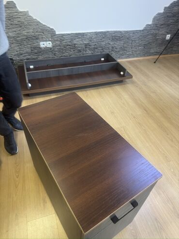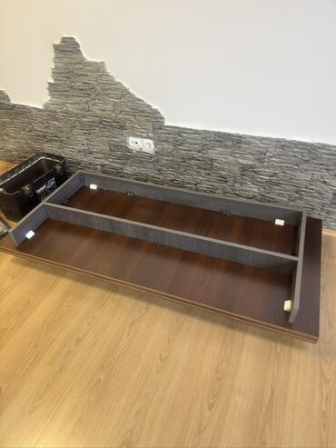 - Material: Laminat/MDF əsaslı taxta səthlər, tünd qəhvəyi üst tabla və boz-ağac teksturalı korpus kombinasiyası.