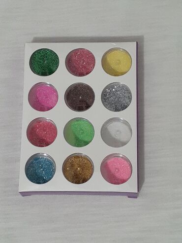 - Qutuda 12 ədəd ayrı kiçik qabda parıltı (glitter) tozu