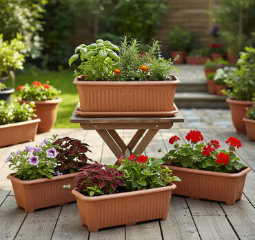 Açıq məkana uyğun taxta çiçək qutuları - Material: təbii şüşə kimi