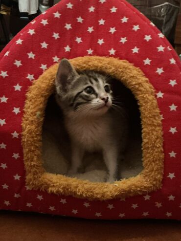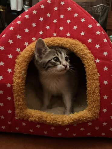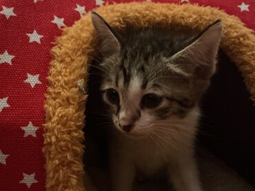 Mehriban, oynaq və insanlar ilə rahat ünsiyyət quran balaca pişik. 5-6 aylıq var. Xüsusiyyətlər: - Rəng: ağ, boz, qara və narıncı çalarların qarışımı (trikolor). - Böyük ifadəli gözlər, dik qulaql...