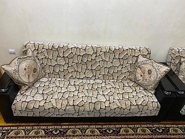 Divan ve 2 kreslo 200manat - Rəng: qəhvəyi/bej tonları - Material: yumşaq parça örtük - Dizayn: qara rəngli, dekorativ xrom xəttlərlə vurğulanmış taxta qol dayaqları - Divan: 3 nəfərlik oturacaq, ...
