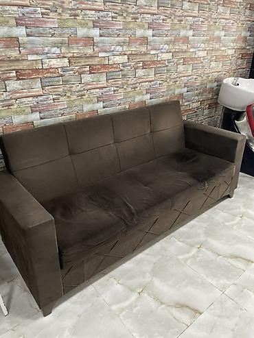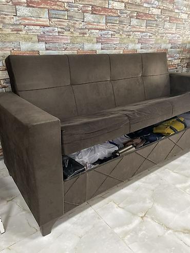 - Divan: Qəhvəyi rəngdə, yumşaq parça üzlü. Geniş oturma yeri və düz xətli arxalıq. Aşağı hissədə iri saxlama bölməsi var – oturacaq hissəsi qaldırılmadan ön panel sürüşmə ilə açılır, içəridə aksesuar və tekstil üçün kifayət qədər yer saxlayır. Hündür, kvadrat formalı qolçular və sabit dayaqlar. Neytral rəng palitrası sayəsində ofis, gözəllik salonu və ya gözləmə zonalarına uyğundur.