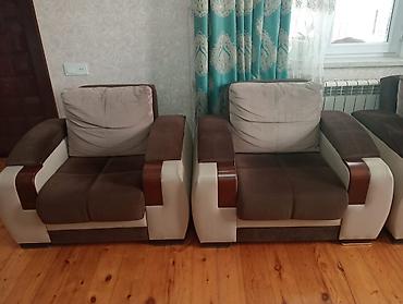 Divan və iki kreslo açılır hamısı baza var ünvan emircanQonaq otağı üçün 3 parçalı dəst: 1 üçnəfərlik divan + 2 tək nəfərlik kreslo. - Rəng: bej oturacaq/söykənəcək hissələri, tünd qəhvəyi baza və...