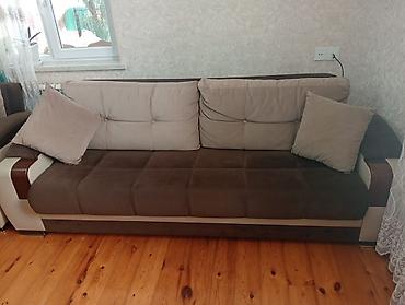Super vəziyyətdə divan + 2 kreslo – real alıcıya endirim - Dəst: 3 yerlik divan (açılır) + 2 ədəd iri kreslo - Dizayn: açıq krem rəngli karkas, tünd qəhvəyi oturacaq hissələri, ağ-qara-gümüş tonla...