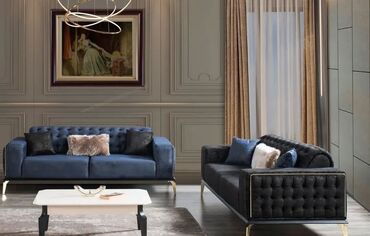 - Rənglər: Tünd mavi, qara/qatranı rəng tonları, bej-krem palitrası; kontrast dekor yastıqları.