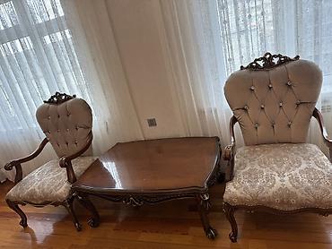 - Kreslolar: Eyni üslubda 2 ədəd kreslo, kapitone kürəklər, taxta qolluq və oyma ayaqlar, naxışlı parça oturacaq.