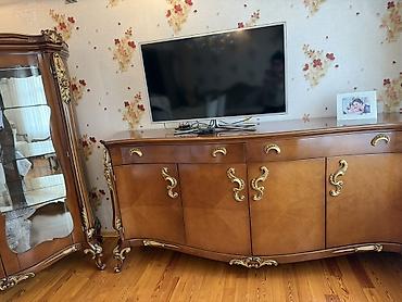 - TV tumbası/büfe: Təbii ağac teksturası, dalğalı konturlar, qızılı dekor elementləri, çoxsaylı şkaf və çekmecələr.