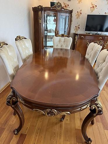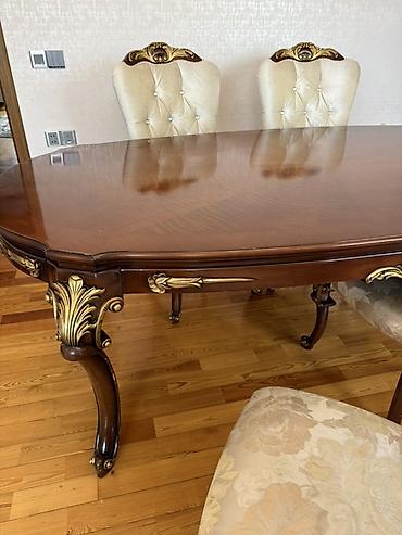- Yemək masası: Oval formalı, laklı taxta üst, barok üslubunda oyma və qızılı dekor, möhkəm əyri ayaqlar.