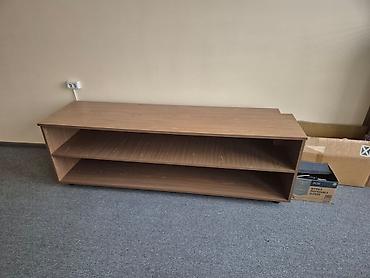 - TV tumbası: Təbii ağac naxışlı laminat örtük, aşağı profilli modern dizayn. İki açıq rəf (üst və alt bölmə) – TV priferiyaları, konsol və aksesuarlar üçün geniş yer. Təkərli baza sayəsində yerini dəyişmək rahatdır.