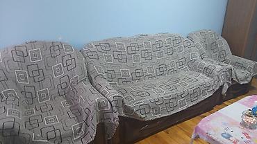 - Yumşaq mebel: 3 hissədən ibarət dəst – üçnəfərlik divan, ikinəfərlik divan və bir nəfərlik kreslo. Üzərində kvadrat naxışlı boz rəngli örtüklər var. Otaqda rahat yerləşim üçün klassik forma və aşağı oturacaq hündürlüyü.