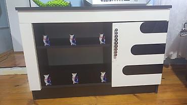 - TV altlığı/komod: İki açıq rəfli, sağda sürgülü/qapılı bölmə. Ağ-qara dizayn, parlaq dekorativ zolaqlar və dikey düyməcik naxışlı tutacaq. Üst hissə genişdir – TV, dekora və ya aparat üçün uyğundur.