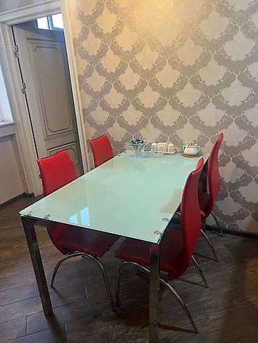 - Yemək masası: Düzbucaqlı, açıq rəngli (açıq şüşə/şəffaf açıq mavi ton) şüşə stolüstü, dörd küncdə metal bərkidicilər, xrom düz ayaqlar. Kompakt ölçü, 4 nəfərlik istifadə üçün rahat.