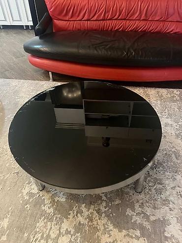 - Jurnal masası: Dairəvi formalı, tünd (qara) şüşə üstlü, metal/xrom ayaqlar. Aşağı profilli konstruksiya, divanla eyni üslubda.