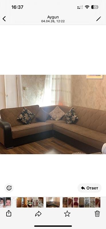 - Yumşaq künc divan dəsti: L formalı, ikirəng (bej və qəhvəyi) parça üzlüklə. Geniş oturacaq və arxalıqlar, çıxarıla bilən iri yastıqlar. Hər iki qol hissəsində funksional tumbalar: biri üst qapaql...