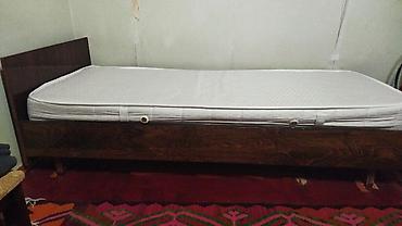 - Tək nəfərlik çarpayı və döşək: Tünd ağac naxışlı başlıq və yan panellər, sabit taxta ayaqlar. Üzərində uyğun ölçülü, aerator dəlikləri olan ortopedik tipli döşək.