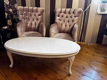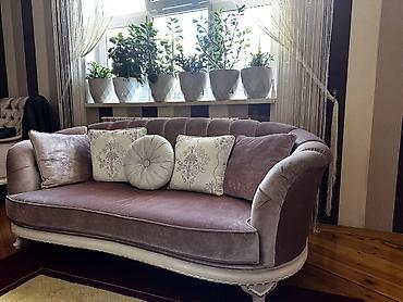 Klassik üslubda qonaq otağı dəsti - Dəst tərkibi: 3 nəfərlik divan, 2 ədəd kreslo, dairəvi orta masa (şüşə üstlü). - Material: yumşaq məxmər tipli parça üzlük; bərk ağac karkas. - Dizayn: kapitone...