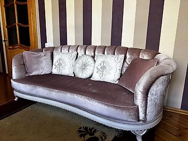 Klassik üslubda qonaq otağı mebel dəsti Tərkibi: - 3 nəfərlik klassik divan – oyma taxta karkas, qızılı-bənövşəyi naxışlı parça oturacaq və arxa hissə, dəri elementlər, dekorativ süni daş/metal iş...