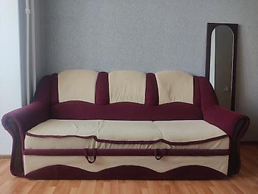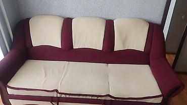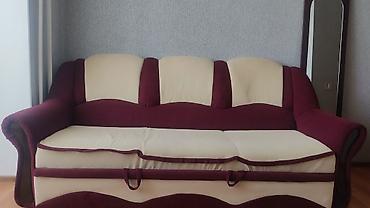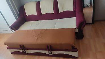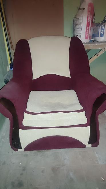 Bordo-krem rəng çalarlarında yumşaq mebel dəsti: 2 ədəd iri kreslo və 1 ədəd divan.