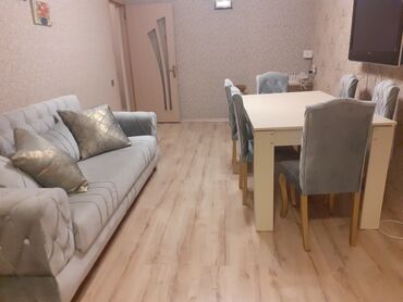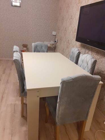 Mebel dəsti – qonaq və yataq otağı üçün Dəst tərkibi: - Yemək masası: düz, parlaq səthli, 6 nəfərlik. - 6 ədəd yumşaq oturacaqlı, boz rəngli kreslo. - Bufet/komod və iri üfüqi güzgü: 4 qapılı, qız...