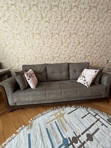 divan - Klassik, düz xətli dizayn: Hündür bel hissə, enli qol dayaqları, dekorativ tikişlərlə bölünmüş oturacaq və arxa hissə. - Material: Yumşaq toxumalı parça (müxtəlif rənglər – boz, göy, qəhv...