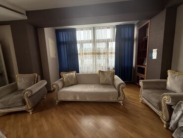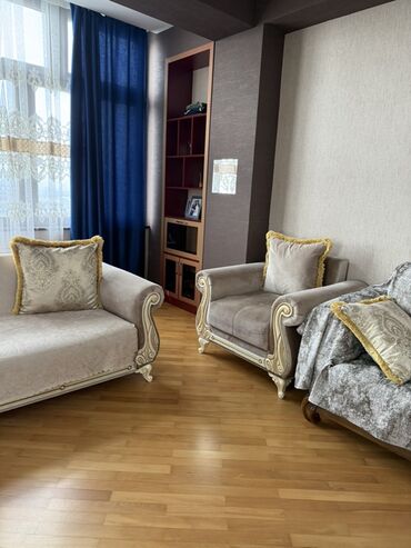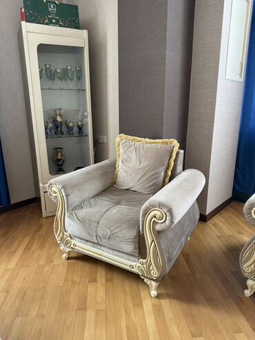 Klassik üslubda oturma dəsti - Tərkibi: 1 ədəd 3 nəfərlik divan, 2 ədəd iri kreslo, 1 ədəd yumru köməkçi puf/taburet. - Rəng və material: Açıq boz (gümüşü) tonlarda məxmərə bənzər yumşaq parça, üz...