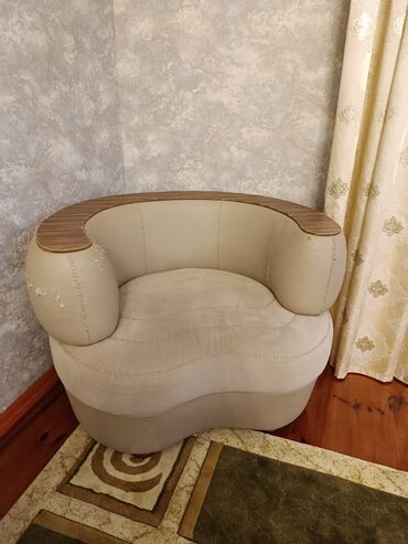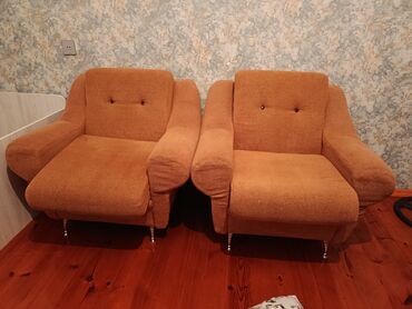 - Kreslolar: 2 ədəd, eyni model və rəngdə. Toxumalı parça örtük, isti kərpic/ağacsayağı narıncı ton. Geniş oturacaq, yumru qoltuqlar, arxalıqda düyməli kapitonaj detalları. Xrom rəngli qısa ayaqlar üzərindədir.