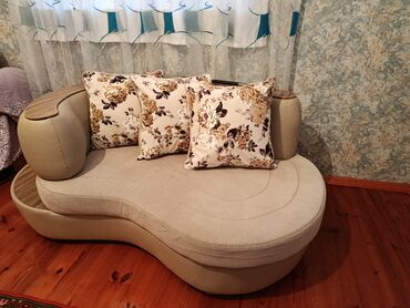 - Divan: orijinal S-şəkilli formaya malik yumşaq oturacaq və yarımdairəvi arxalıq. Arxalığın üst hissəsində ağac teksturalı dekorativ panellər var, kənarlarında iri tikiş xətləri vurğulanıb. Bej rəngli parça/deri kombinasiyası ilə hazırlanıb. Dekorativ çiçək naxışlı 3 ədəd kvadrat yastıqla göstərilib.
